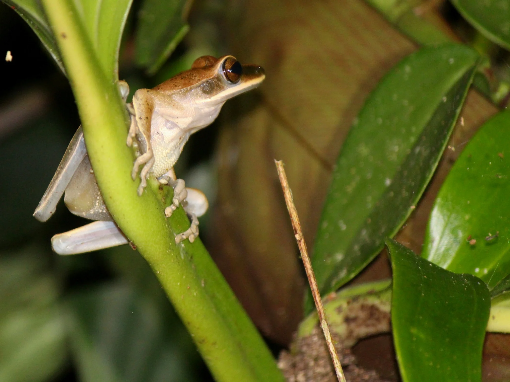 While in Tambopata EcoLodge the group went on a night excursion around the grounds close to the lodge. Armed with a head torch and camera in hand, I searched for wildlife in the darkness. of course. Lots of insects, spiders and such unusual sounds in the dark rain forest. Our guide pointed out this tree frog perched on this branch which stayed while we got some photos.